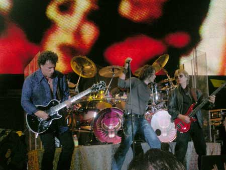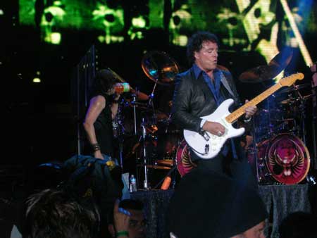 Neal Schon and Ross Valory roamed freely, but the biggest surprise for me was watching Jonathan Cain while acting as second guitarist. He spent a lot of the time center stage, frequently hamming it up and during Chain Reaction, followed JSS' invite to the far side of the stage for some crowd pleasing jamming.