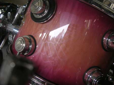 Deen's drum kit - split in two for ease of mobility & up close you can see the Journey emblem built into each piece of the kit.