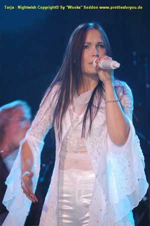 By the time the headliners made their dramatic entrance, the show was running over 30 minutes behind schedule. Nobody seemed to mind once the lights dimmed and the choral/spoken section at the opening to 'Bless This Child' echoed out from the PA. The band members appeared one by one and finally Tarja Turunen dressed entirely in shimmering white made her grand entrance