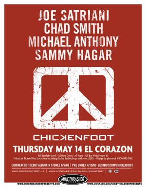 MORE PANDEAMONIUM FROM SAINT DEAMON: Frontiers Records is excited to announce the release of the new album from Saint Deamon Pandeamonium on May 22 in Europe and June 9 in the USA. Named after a fictitious ghost rider called S. Deamon, and with a nod towards the contrast between the heavenly/diabolical feel of the name, the Saint Deamon was put together in 2006 by drummer Ronny Milianowicz (ex Dionysus and songwriter for Primal Fear, Cans and Place Vendome among others), together with bass player Nobby Noberg (also ex Dionysus), guitar virtuoso Toya Johansson and the golden voice of the Norwegian Jan Thore Grefstad (ex Highland Glory). The band debuted in early 2008 with a stunning album "In Shadows Lost From the Brave", a record that garnered great acclaim from both critics and fans. Saint Deamon toured extensively in support of the release during 2008, with gigs in Sweden, Norway, Austria, Italy, England and USA appearing in some of the world's finest metal festivals like Prog Power US and Bloodstock UK creating a vast buzz being one of the hardest working band in the scene. Just over a year after the release of their debut album, Saint Deamon are back with a strong head wind in their sails with the worthy follow up "Pandeamonium". Produced by two of the world's most famous Heavy Metal producers, Roy Z (Judas Priest, Halford, Helloween, Bruce Dickinson, who also co-wrote the album's title track with the band) & Jens Bogren (Opeth, Paradise Lost, Amon Amarth), "Pandeamonium" shows a well oiled Metal machine that has no limits in terms of inspiration, musical direction and focus, dedicated members or professionalism. "The chance to work with Roy was actually pure luck", explains founder and drummer Ronny Milianowicz "He had been renting our studio for 4 weeks to work with the new Wolf album and I was just there to brew some coffee, drive his equipment here and there to different recording places and to make his time in Sweden as pleasant as possible. But after 4 weeks together we became friends and I really mean FRIENDS, you know that kinda friend you can call in the middle of the night if you really need to. So one night at the local bar the night before his flight were supposed to go back he decided to stay, and this after being 4 weeks in our studio already! And with Jens we have the solid ground that never let us down and that make us perform that little extra out of every take in the studio. I hardly think we will ever work without him". Ronny enthuses: "I really believe that our fans can hear the true passion and brotherhood in the production of Pandeamonium". Final Track listing of Pandeamonium includes: Deception; The Only One Sane; Pandeamonium; Eyes of the Devil; A Day to Come; Way Home; Fallen Angel; The Deamon Within; Oceans of Glory; Fear In a Fragile Mind. Also includes Pandeamonium (videoclip). So prepare to sail on, on the Metal seas, with Saint Deamon and their crew into the "Pandeamonium"! xx![]() ROCK SUPERGROUP "CHICKENFOOT" ANNOUNCE DEBUT ALBUM AND EUROPEAN TOUR: Rock supergroup Chickenfoot is set to release their debut self-titled album in June. Comprised of former Van Halen and Montrose vocalist Sammy Hagar, Red Hot Chilli Peppers drummer Chad Smith, former Van Halen bassist Michael Anthony and world renowned electric guitarist Joe Satriani, the band is being hailed as one of the most exciting rock and roll guitar bands since Led Zeppelin. The debut album, which will be packaged in exclusive "heat sensitive" artwork, will be released on edel entertainment's recently launched new international rock label earMUSIC in Europe, Australia and Japan on Friday June 5th and in the UK on Monday June 8th, the album will be released by Best Buy in America on Sunday June 7th. Full Chickenfoot Track Listing: 1. Avenida Revolution, 2. Soap on a Rope, 3. Sexy Little Thing, 4. Oh Yeah, 5. Runnin' Out, 6. Get It Up, 7. Down the Drain, 8. My Kinda Girl, 9. Learning to Fall, 10. Turnin' Left, 11. Future in the Past. xx![]() The album will coincide with a European tour in June and July that will take in a number of outdoor festivals and intimate indoor dates, including a rare concert at the London 02 Shepherd's Bush Empire on Thursday June 25th. Tickets for the London show are priced at £29.50 and go on sale Friday March 27th at 9am. Box Office: 08444 77 2000, Book Online: www.livenation.co.uk. 24 hour credit card hotline: 0844 576 5483. Chickenfoot 2009 European Tour Saturday June 20 Austria Nova Rock Festival Tuesday June 23 Cork, Ireland: Live At The Marquee Thursday June 25 London Shepherd's Bush Empire Friday June 26 Holland: Heerhugowaard Sunday June 28 Belgium Graspop Metal Meeting Festival With Marylyn Manson, Nightwish, Disturbed Monday June 29 Paris: Olympia Wednesday July 1 Madrid (Venue Tbc) Friday July 3 Pistoia, Italy: Blues Festival (Line-Up Tba) Saturday July 4 Montreux, Switzerland: Stravinski Hall Featuring Steely Dan, Dave Matthews, Chickenfoot Sunday July 5 Udine, Italy: Lignano Sbbiadoro Tuesday July 7 Hamburg: Grosse Freiheit Wednesday July 8 Copenhagen: Vega Friday July 10 Kilafors, Sweden: Rockweekend Festival Sunday July 12 Weert, Holland: Bospop Festival - Featuring Bryan Adams, Journey And Chickenfoot. Bio: "Rarely has a band come freighted with such expectation and promise than the new outfit that calls itself Chickenfoot. Yes, you read correctly - Chickenfoot. Say that name again, just to get used to its sound. Chickenfoot. It's a silly name for a band - - and album - - that kicks a donkey's ass six ways to Sunday and back again. Maybe that's because long before the four men who comprise Chickenfoot came together they already filled the pages of rock history with enough individual mind-blowing chapters to boggle the mind. The news that they've pooled their inordinate talents to one collective whole quickly spread across the Internet last year (and perhaps that crazy name helped just a little). The fact that they've succeeded artistically beyond anyone's wi