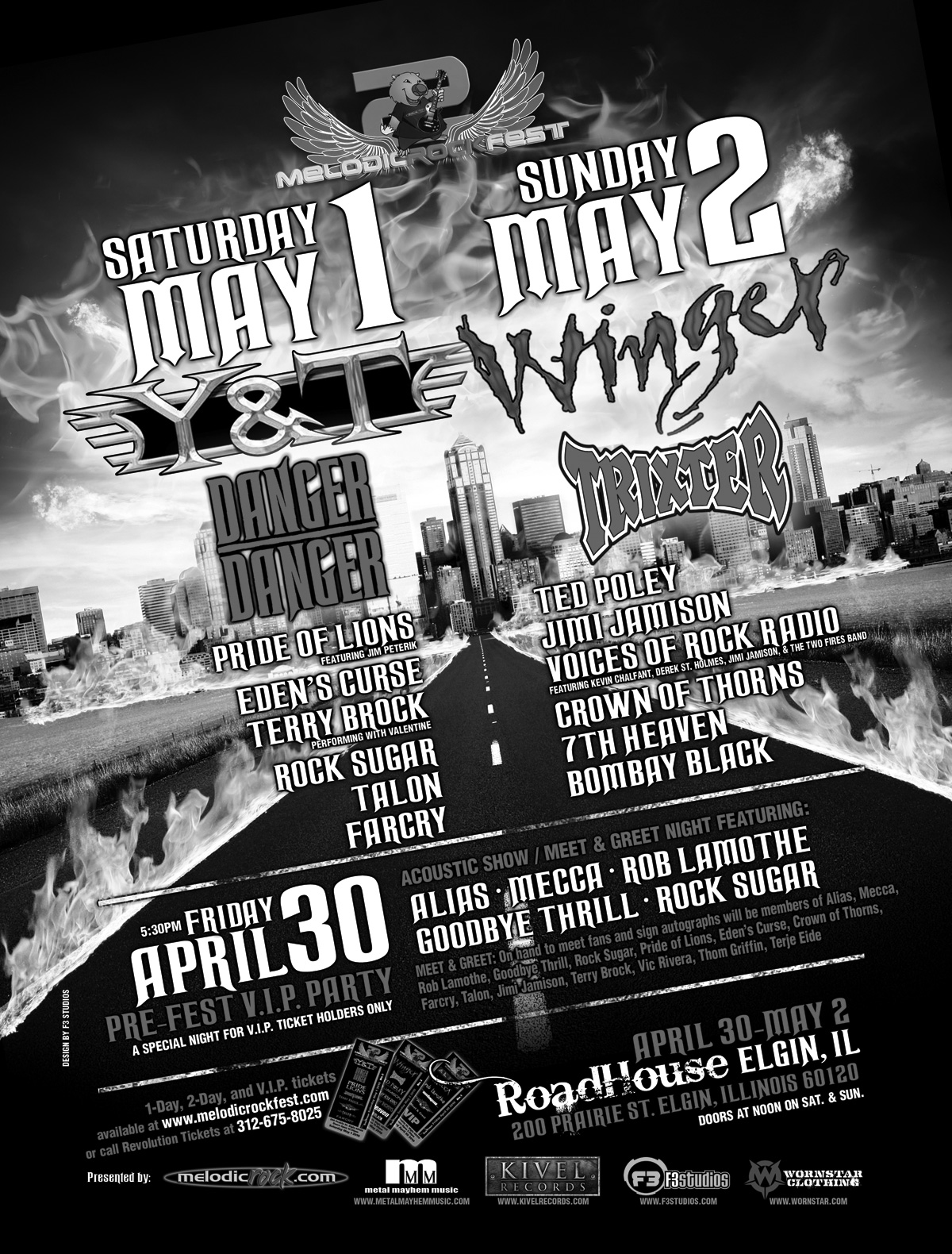 ![]() MelodicRockFest 2 is just over 6 weeks away, so time for a few updates regarding the festival. - Kevin Chalfant has requested we do something special with his and pal Jimi Jamison's sets. So it will be something like this: a combined performance, with no break between set, with Jimi performing with Kevin's backing band. Kevin's set will now be billed as the Voices Of Rock Radio and will include special guest Derek St. Holmes (Ted Nugent Band) and maybe another guest. Plus Jimi of course, before Jimi takes center stage for his own solo material. - Tickets arrive back from the printer tomorrow, so will be sent out airmail to all this week! Expect delivery within 5-10 days. - Refunds: I am no longer refunding any VIP weekend tickets due to the W.E.T. cancellation. The festival itself is going on without any further alteration and I appreciate the support on this issue. - Sponsors: Despite several weeks of looking for an official event sponsor, I have come up empty. It has been impossibly hard to get any business (large or small) to support the show and even the US brewing companies seem to have dry wells. A cash sponsor was one of the vital issues that took away from MRF1, it would be great to have that backing this time around, given the caliber of the lineup. I am very grateful to a few individuals that have helped sponsor the event out of passion for this scene, but it would be great to have a company on board also. If anyone has any connections to any forward sighted companies that would like to be involved in the show, please let me know. - Radio Commercial: Thanks to the always brilliant ARfm, there is now a 1 minute audio commercial for the event, which I hope to get to radio soon. But you can also download it yourself and help spread the word around. A YouTube clip of the advert will be online this week. Download Here. - Local advertising in the Chicago area will be taking place from next week, but if anyone out there can print and distribute flyers, please contact me. - A brand new updated Press Release is also available for the show at the official website. - On Friday night: I'm hearing Rob Lamothe has a very special acoustic set for eager fans. - Finally: a Credit Card hotline for ticket orders is now in place for those that don't have Paypal. Please call Revolution Tickets at: (USA) 312-675-8025. |