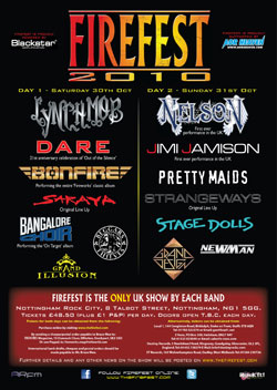 FRONTIERS RECORDS SIGNS THE LEGENDARY BAND FOR NEW ALBUM WORLD-WIDE: Frontiers Records is very proud to announce the signing of legendary rock band Whitesnake. David Coverdale and band are gearing up for their latest endeavour. Whitesnake has already started composing new material that promises to deliver one of the finest chapters in Whitesnake'S career. "We are off to a very good start, with the new songs taking positive shape. It feels good, fresh & exciting," explains Coverdale. The next release already feels like a solid, natural progression to their last opus, the successful, critically acclaimed 'Good To Be Bad' album, awarded by the influential Classic Rock magazine as "Best Album of the Year" in 2008. "As always, we want to take it to the next level," states' Coverdale. "I feel that with the last album we achieved a strong Whitesnake 'cocktail' that comfortably embraced & mixed all the previous musical aspects & styles of the band's history, while taking our identity a little further... all on one album..." Born in 1977, Whitesnake have been among the most influential representatives of the their genre, having produced numerous rock music classics such as 'Here I Go Again', 'Is This Love', 'Still Of The Night', 'Fool For Your Loving', 'Ain't No Love In The Heart Of The City' or 'Walking In The Shadows Of The Blues'. Coverdale said the production team for the new album will most likely be the infamous Brutal Brothers, or Los Bros Brutalos, who handled the recording of "Good To Be Bad". "The new songs are in the very familiar and recognizable Whitesnake territory of soulful, bluesy, melodic power rock, with a couple of ballads thrown in for good measure... It can't be a Whitesnake album without ballads, mate!" Whitesnake have conquered the love and respect of the audiences all over the world with their driving shows and music. The new album promises to follow in the steps of a great heritage of solid and timeless songs. For more information, please visit www.whitesnake.com and www.frontiers.it. ![]() FIREFEST 2010 – PRESS RELEASE: Firefest UK Press Release / "For our 2010 show we've decided to go for two full days, with a slightly later start time and just seven quality bands per day. We think we've put together a bill that should please many devotees of melodic hard rock and have arranged several special sets to celebrate well-loved albums and anniversaries. Several acts will be making their first appearances on UK soil whilst others have been much missed and will be returning after many years away. Here are the details…" Venue and dates - Firefest will take place on Saturday 30th and Sunday 31st October 2010 at our regular venue of Rock City in Nottingham. Line-up Saturday October 30 (Top to bottom) Lynch Mob It's been twenty years since ex-Dokken guitar virtuoso George Lynch last graced a UK stage. During that time he's explored new directions and in 2009 came full circle when he re-united with original Lynch Mob singer Oni Logan to deliver the excellent 'Smoke & Mirrors' album. The band have had great reviews since they hit the road last year so expect an explosive set taken mostly from their latest opus and their classic 'Wicked Sensation' debut. Dare The UK melodic rockers led by Darren Wharton last graced a Firefest back in 2005 at our inaugural show and have yet to play a UK date since original guitarist Vinny Burns rejoined two years ago. Twenty-one years have passed since their classic 'Out Of The Silence' debut was released so it's a great honour for us to have the band base their set around that popular record. Bonfire The enduring German hard rockers have been around in one guise or another since the late 70's but really started to make waves on both sides of the Atlantic with their classic 1987 album 'Fireworks'. With a very special set to celebrate the album that gave Firefest's sister magazine it's name, Claus Lessmann, Hans Ziller and co. will play the 'Fireworks' record in its entirety. Saraya Continuing Firefest's proud record of providing the unexpected, the US rock band led by Sandi Saraya and Tony 'Bruno' Rey are back after an eighteen year hiatus. Keyboard player Gregg Munier tragically passed away in 2006 but all other original members will be present to play a set based around their melodic debut album, with a smattering of their harder edged 'When The Blackbird Sings' album for good measure. Bangalore Choir Another cult US hard rock band will grace our stage in the shape of Bangalore Choir. Their 1992 debut album 'On Target' is well-respected for its sublime mixture of melody and crunch, and led by ex-Accept singer David Reece and guitarist Curtis Mitchell the band will play the whole record. It'll be their first ever show in the UK and we're sure they'll be made very welcome. Beggars & Thieves Two years ago singer Louie Merlino and guitarist Ron Mancuso played a short acoustic set at the Friday night meet & greet for Firefest V, so we're delighted to welcome them back with a full band. They're currently in the studio recording a new album so will have some new songs to play alongside the highlights from their first three records. Grand Illusion After a break of four and a half years Sweden's Grand Illusion have decided to give it another go. The original trio of Anders Rydholm, Peter Sundell and Per Svensson are currently recording a new album with some pretty high profile guests and with three strong releases already under their belts they have a wealth of upbeat melodic rock songs to get the party off to a good start. Sunday October 31 (Top to bottom) Nelson Twins Matthew and Gunnar Nelson caused a stir in 1990 when their first single '(Can't Live Without Your) Love And Affection' reached the top of the US charts. They would go on to create several high quality albums throughout the 90's and are applying the finishing touches to a new release called 'Lightning Strikes Twice' as we speak. Despite their rich heritage this will be their first ever UK 